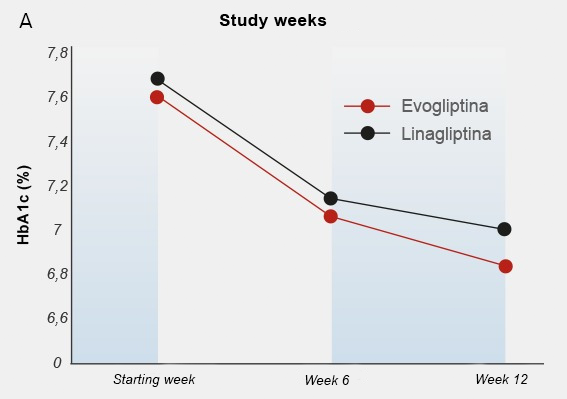 The objective of EVERGREEN10 study was to evaluate the efficacy, through the reduction of HbA1c and the modification of parameters of continuous glucose monitoring (CGM) and the safety of evogliptin, using linagliptin as an active control. In this double-blind, multicentric study, 207 patients with type 2 diabetes mellitus with HbA1c between 7.0 and 10.0% were randomized 1:1 to treatment with evogliptin 5 mg/day (n-102) or linagliptin 5 mg/day (n« 105) for 12 weeks, followed by an extension period of an additional 12 weeks.​​